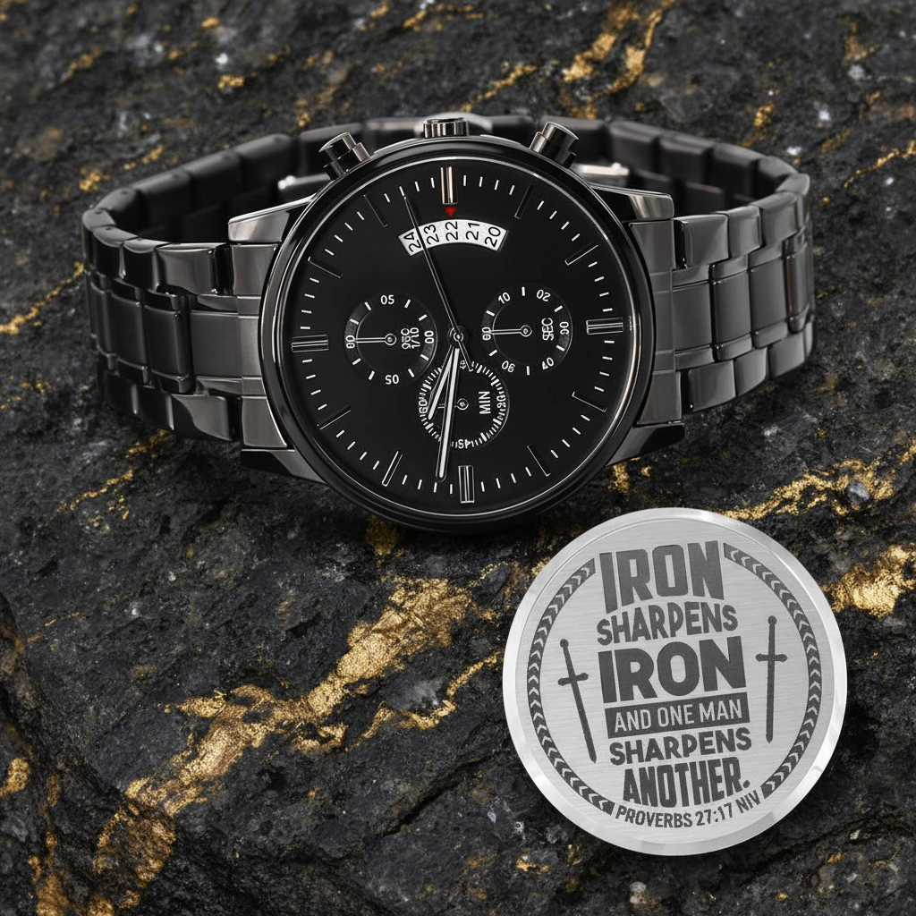 Every time he checks the time, he'll be reminded of Proverbs 27:17 and the importance of godly friendships that sharpen, refine, and challenge. It's more than a watch—it's a daily reminder of the brotherhood that makes us better, the accountability that keeps us strong, and the relationships that sharpen us like iron.