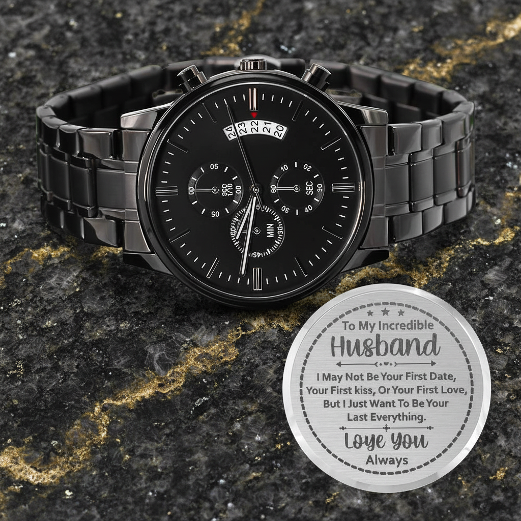 Give your husband a gift that speaks from the heart with this Engraved Design Black Chronograph Watch. More than a timepiece, it's a romantic declaration: he's your last everything—your last first kiss, your last first date, your last love. Every glance at his wrist becomes a reminder that you'd choose him again, today and every day.