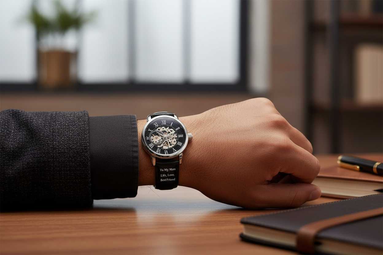 People will notice this watch. They'll ask about it. They'll want to see the movement in action. Every time someone compliments it, he'll be reminded that he's wearing something truly special—a gift from the person who sees him as life, love, and best friend.